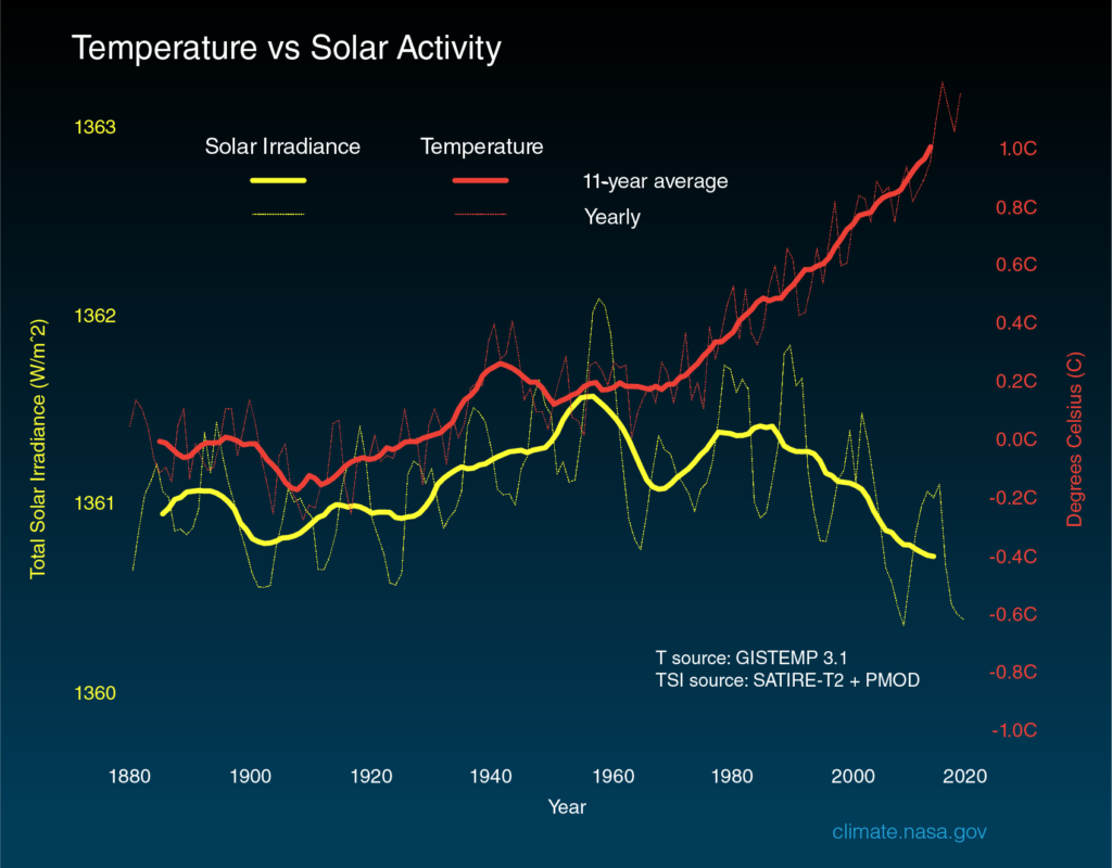 Σχετικά η NASA έχει κυκλοφορήσει γραφήματα που δείχνουν την ηλιακή δραστηριότητα να μειώνεται σε αντίθεση με τις αυξανόμενες θερμοκρασίες του πλανήτη. Αυτό που επιθυμεί είναι να απορρίψει την εξάρτηση των θερμοκρασιών από τον ήλιο.