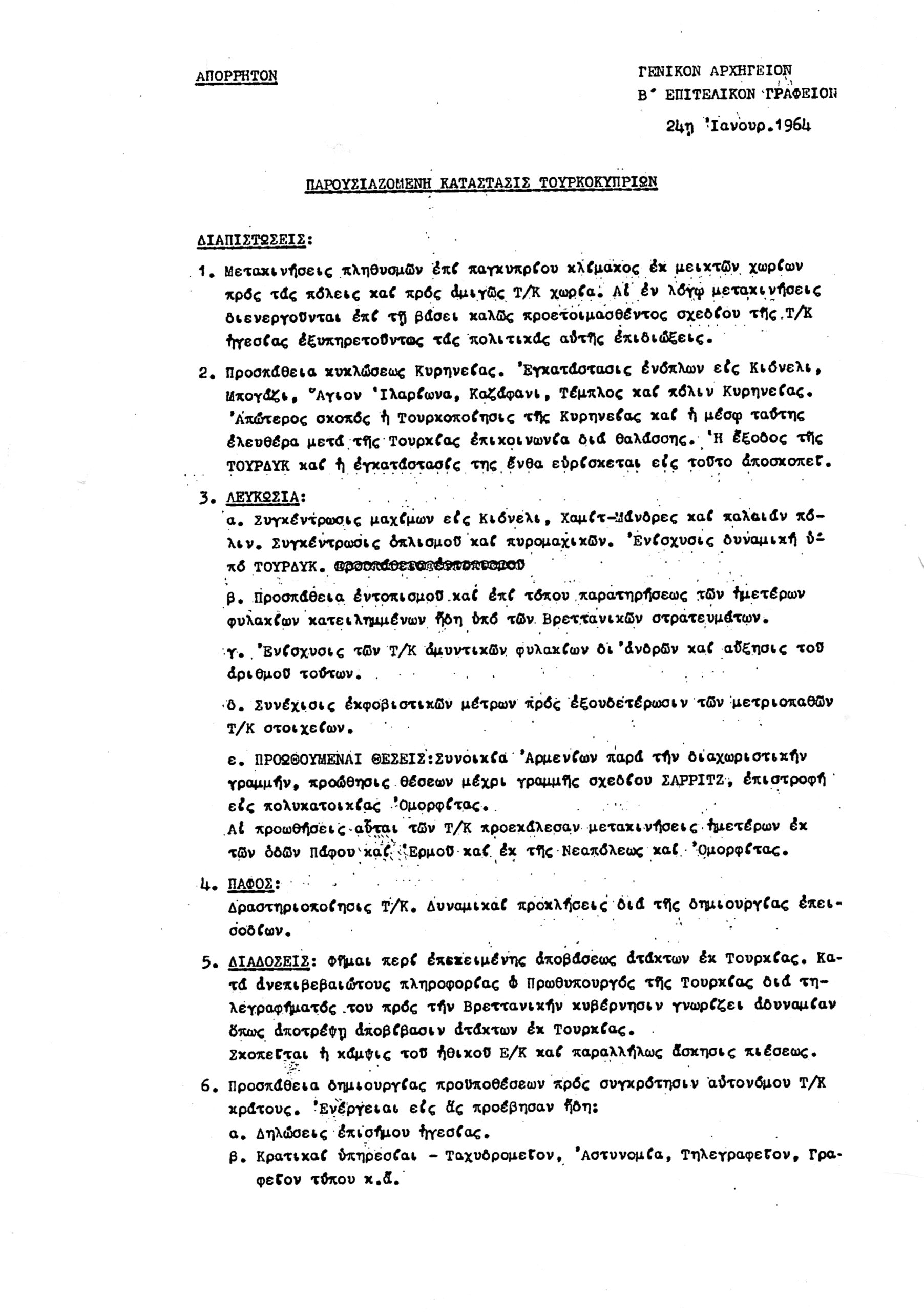 - Μετακινήσεις πληθυσμών επί παγκυπρίου κλίμακος εκ μεικτών χωρίων προς τα πόλεις και προς αμιγώς Τουρκοκυπριακά χωριά. Αι εν λόγω μετακινήσεις διενεργούνται επί τη βάσει καλώς προετοιμασθέντος σχεδίου της Τουρκοκυπριακής ηγεσίας εξυπηρετούντως τας πολιτικάς αυτής επιδιώξεις.