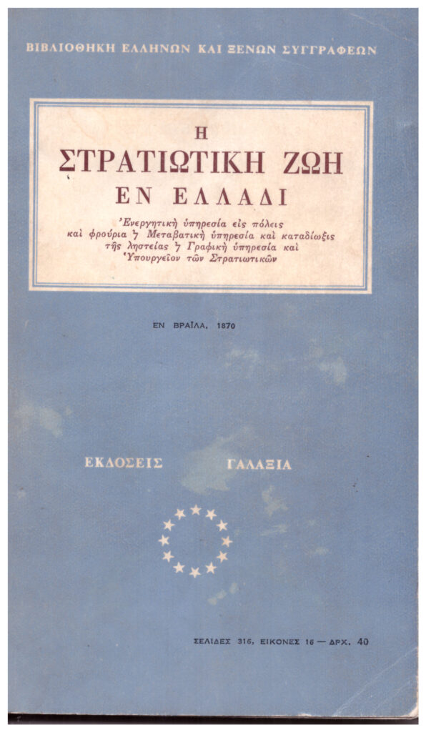 Ευρισκόμεθα στο ἐτος 1870 και ξαφνικά εκδίδεται ανωνύμως στη Βραΐλα της τωρινής Ρουμανίας, από το ελληνικό τυπογραφείο “Το Τρίγωνον” βιβλίο με τίτλο “Η στρατιωτική ζωή εν Ελλάδι”. Ο συγγραφέας υπήρξε ανώνυμος και παραμένει άγνωστος. Είναι όμως το εν λόγω κείμενο τόσο γλαφυρό και τόσο συναρπαστικό, ώστε, ακριβώς εκατό χρόνια αφότου κυκλοφόρησε, το 1970 συγκεκριμένα, επανεκδόθηκε από τις αλησμόνητες “Εκδόσεις Γαλαξία”.