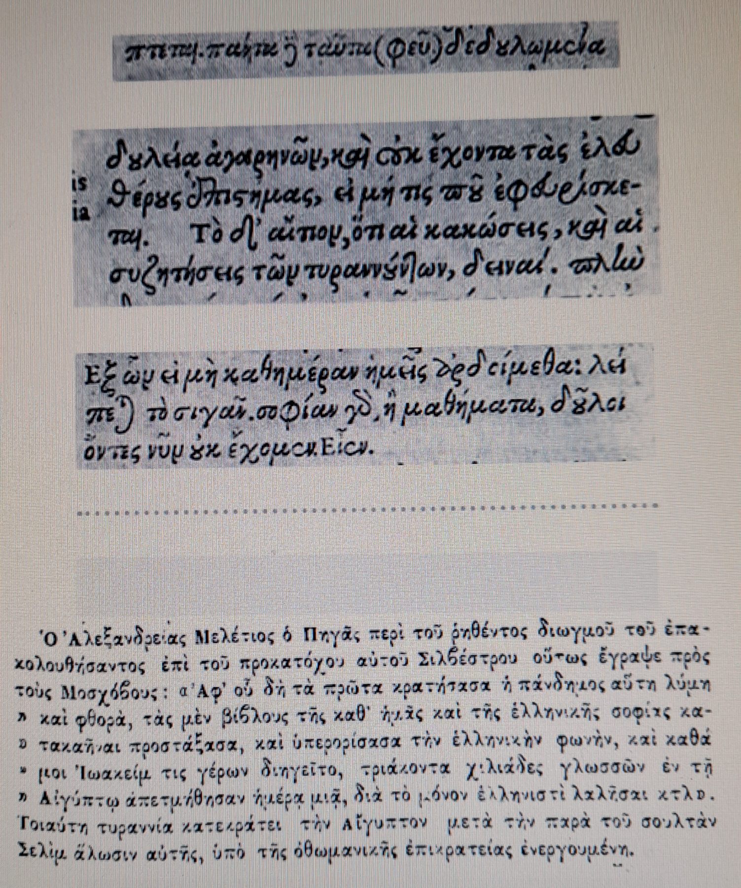 - Το 1627, Μητροφάνης Κριτόπουλος, Πατριάρχης Αλεξανδρείας. Επιστολή στον Γερμανό καθηγητή Bernegger.