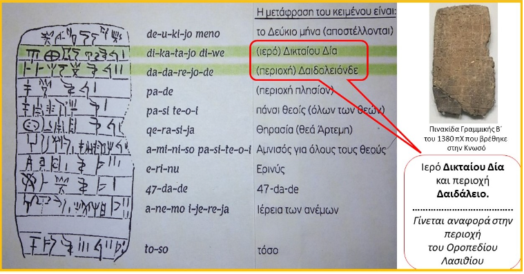 Σε πήλινη πινακίδα με γραμμική γραφή Β΄ που ανακαλύφθηκε στην Κνωσό και χρονολογήθηκε ότι κατασκευάστηκε το 1380 πΧ αναφέρονται τα ιερά του Δικταίου Δία και το Δαιδάλειο, που όπως συμπεραίνεται από την πινακίδα ήταν τα πιο απομακρυσμένα από την Κνωσό, δηλαδή ψηλά στο ιερό Οροπέδιο του Δία.