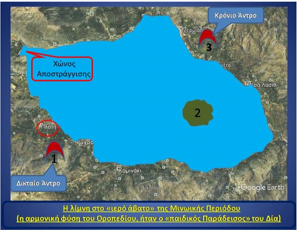 Και τότε ο Δικταίος Δίας έκανε ένα υπερκόσμιο θαύμα, δίνοντας ελπίδα ζωής στους τρομοκρατημένους Μινωίτες. Μπροστά στα έκπληκτα μάτια των προσκυνητών, έλαβε χώρα ένα μοναδικό φαινόμενο, ένα θαύμα, που μόνο ο πατέρας των Θεών και του Μίνωα, ο Δικταίος Δίας μπορούσε να πραγματοποιήσει. Το νερό της λίμνης του Οροπεδίου, άρχισε να εξαφανίζεται μέσα στη γη στα δυτικά, προς την περιοχή του χώνου. Οι καταβόθρες που δημιουργήθηκαν από τους ισχυρούς σεισμούς, οδήγησαν υπογείως τα νερά της λίμνης έξω από το ιερό Οροπέδιο.