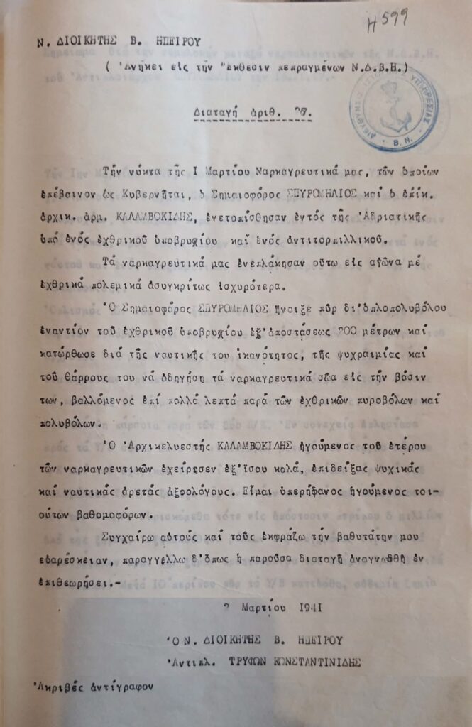 Την 1/3/1941 που διατάχθηκε η χρησιμοποίηση του όρμου Πανόρμου στη Χειμάρρα, για ανεφοδιασμό των υποβρυχίων που επιχειρούσαν στην Αδριατική, εστάλησαν δύο μικρά ναρκαλιευτικά. Στο ένα το “Ταξιάρχης”, επέβη ως κυβερνήτης ο Έφεδρος Σημαιοφόρος Σπυρομήλιος και στο άλλο το “Αγγελική” ο Καλαμποκίδης. Ο οπλισμός του πρώτου ήταν ένα φορητό πολυβόλο και του άλλου μόνο το περίστροφο του Καλαμποκίδη.