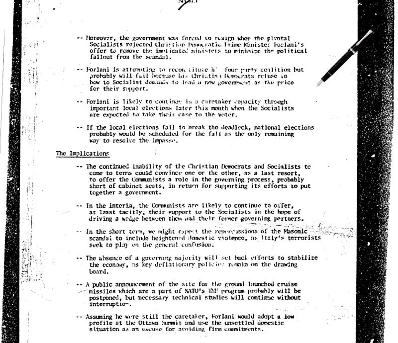 - η δολοφονία του Ιταλού πρωθυπουργού Άλντο Μόρο, το 1978, προκειμένου να αποτραπεί το σχέδιό του περί ενός «ιστορικού συμβιβασμού» μεταξύ του Χριστιανοδημοκρατικού Κόμματος και του Ιταλικού Κομμουνιστικού Κόμματος.