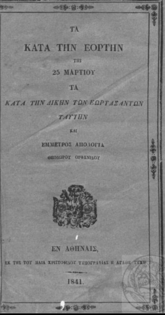 Επομένως, με τους ζώντες Φιλικούς και Ιερολοχίτες παραγκωνισμένους, τους αγωνιστές στη φυλακή ή εκτελεσμένους, χωρίς αποζημιώσεις και πάμπτωχους, τα μοναστήρια να κλείνουν και να απαλλοτριώνεται η περιουσία τους, με ρήξη μεταξύ Εκκλησίας- Όθωνα, είναι εντελώς αυθαίρετο και έωλο το επιχείρημα πως τάχα, την 25η Μαρτίου την επέβαλαν ως Εθνική Εορτή ο Όθων και η κατεστημένη Εκκλησία με το Βασιλικό Διάταγμα του 1838!