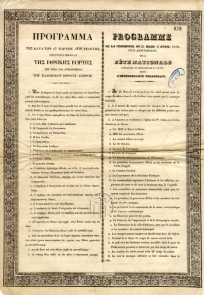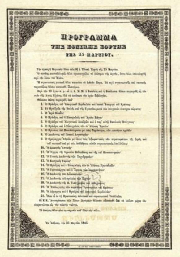 Εν κατακλείδι και εν συντομία: Δεν επέβαλαν την 25η Μαρτίου 1821, ως Εθνική Επέτειο οι Βαυαροί και η Επίσημη Εκκλησία, αλλά συνέβη το ακριβώς αντίθετο. Την επέβαλαν οι ζώντες το 1838, Φιλικοί, Ιερολοχίτες, Αγωνιστές και ο λαός με τους λαϊκούς ιερείς και Αρχιερείς, παρά τους διωγμούς που υφίσταντο από το 1831 μέχρι και το 1838, ακόμα και το 1841, ενώ η Αυλή ούτε αποκατέστησε τους αγωνιστές (χιλιάδες τα αιτήματά τους στο Αρχείο Αγωνιστών 1821, στην Εθνική Βιβλιοθήκη – Ίδρυμα Σταύρος Νιάρχος ), ούτε καν στις κηδείες τους πήγαινε (ούτε καν στη κηδεία του Κολοκοτρώνη). Η εορτή επανήλθε με το 1845, βλ. φωτό προγράμματος εορτασμού.
