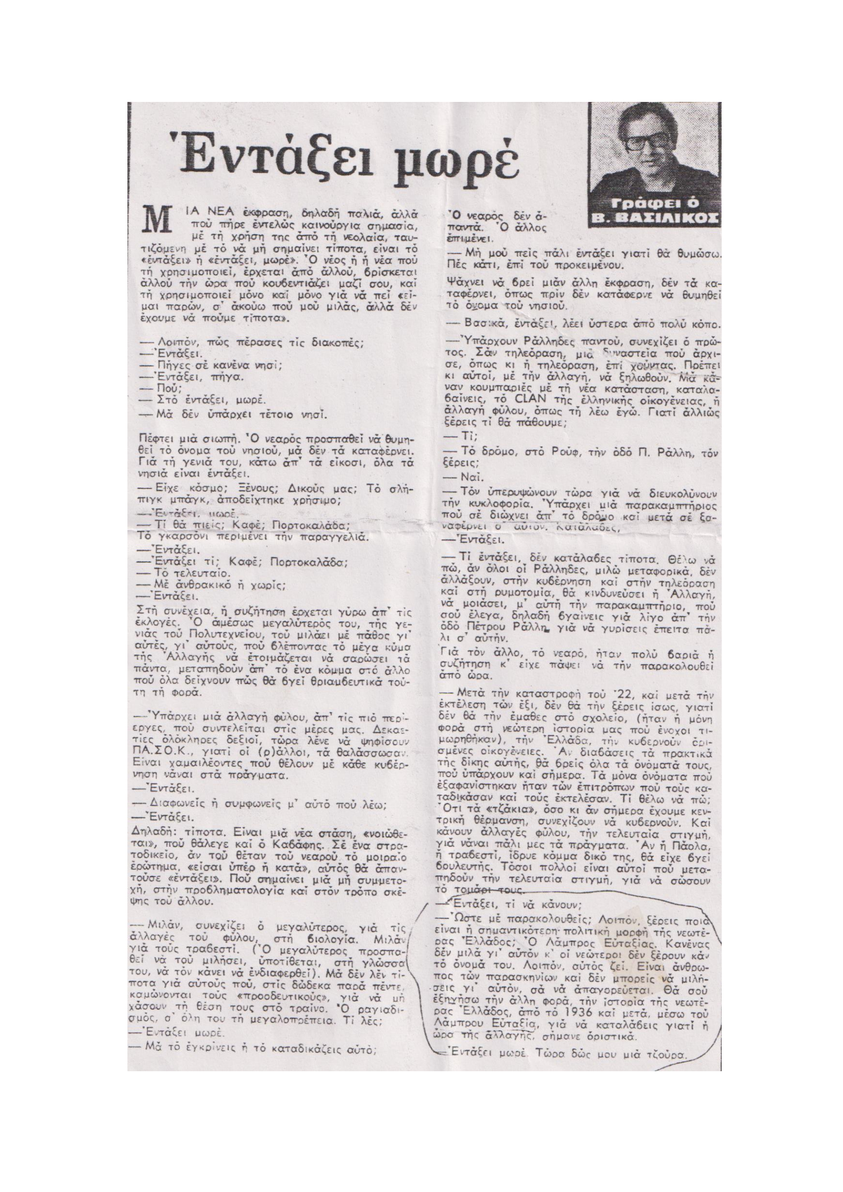 Ευρισκόμεθα στις 9 Σεπτεμβρίου 1981 και στο φύλλο της πολύ σημαντικής (influential) εφημερίδας “Τα Νέα” δημοσιεύεται άρθρο του Βασίλη Βασιλικού με τίτλο “Εντάξει μωρέ”. Η χρήση αυτής της δημοφιλούς αποστροφής μπορεί να θεωρηθεί ως ακόμη ένα τεκμήριο της οξυδέρκειας του συγγραφέα μας. Και αυτό, διότι συνήθως με αυτήν εμείς, οι Έλληνες, “ξεφορτωνόμαστε” τον συνομιλητή που έχουμε βαρεθεί. Εντάξει μωρέ, λοιπόν, ο Βασιλικός και εκεί, στο κείμενό του, στο πλαίσιο συζήτησης που αρχίζει με το “νησί των διακοπών”, συνεχίζεται με την πορτοκαλάδα τη “με ή χωρίς ανθρακικό” και καταλήγει στην πολιτική, κάνει την εξής εκπληκτική δήλωση: