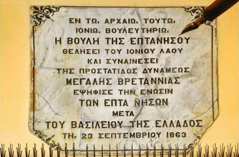 Το ψήφισμα της “Ενώσεως των Επτανήσων με την Ελλάδα” διατύπωσε στη Βουλή της Επτανήσου ο Αριστοτέλης Βαλαωρίτης και διαβάστηκε στην πανηγυρική συνεδρίαση της 5ης Οκτωβρίου 1863 της ΙΓ’ Βουλής. Στις 29 Μαρτίου 1864, υπογράφτηκε στο Λονδίνο η Συνθήκη παραχώρησης της “Ηνωμένης Πολιτείας των Ιονίων Νήσων” στο ελληνικό κράτος και στις 21 Μαΐου 1864, ο τελευταίος Άγγλος αρμοστής Έρικ Στορκς, παρέδωσε τα Επτάνησα στον απεσταλμένο της ελληνικής κυβέρνησης Θρασύβουλο Ζαΐμη.