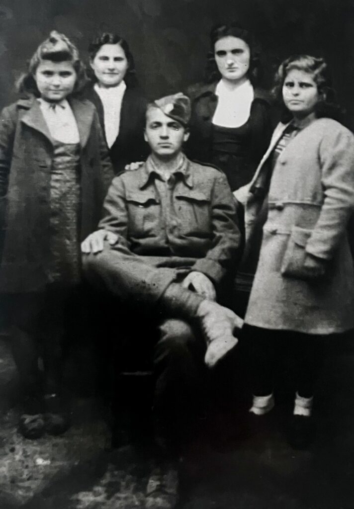Ο Θύμιος με τη στολή του ΕΛΑΣ ανάμεσα στις αδελφές του Φρόσω μπροστά αριστερά και Βαγγελίτσα πίσω δεξιά (φωτ. «Αρετή Παπακόγκου & Θύμιος Βαρβάκης. Μικρό Αφιέρωμα Μνήμης», Αθήνα 2024).