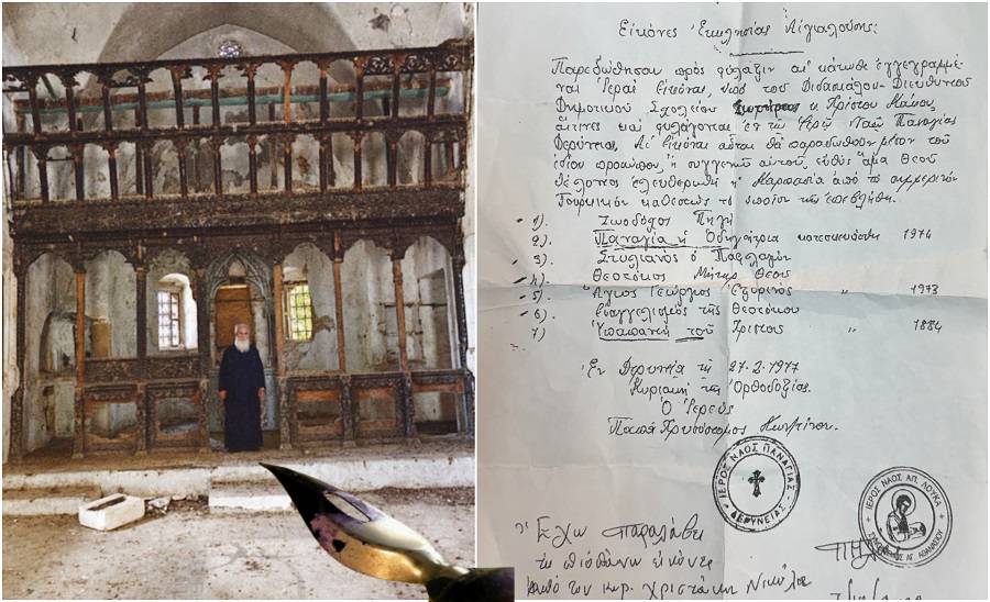 Φρόντισε από πολύ νωρίς ο διάκος, σε συνεργασία με τη δασκάλα Δώρα Στεργίδου, που είχε έλθει στο πλαίσιο της συμφωνίας της Τρίτης Βιέννης από τη Βρετανία στο χωριό για να εργαστεί στο σχολείο, τη φυγάδευση των θρησκευτικών θησαυρών. Οι εικόνες και τα θρησκευτικά κειμήλια ανήκαν στις εκκλησίες της Αγίας Μαρίνας, του Αγίου Θύρσου, της Αγίας Σολομονής, της εκκλησίας της Παναγίας της Ζωοδόχου Πηγής και του Αγίου Γεωργίου. Παρόμοιοι σχεδιασμοί έγιναν για τη φυγάδευση εικόνων και από άλλες εκκλησίες του χωριού που ανέλαβαν να διεκπεραιώσουν άλλοι ιερείς με συγχωριανούς μας.