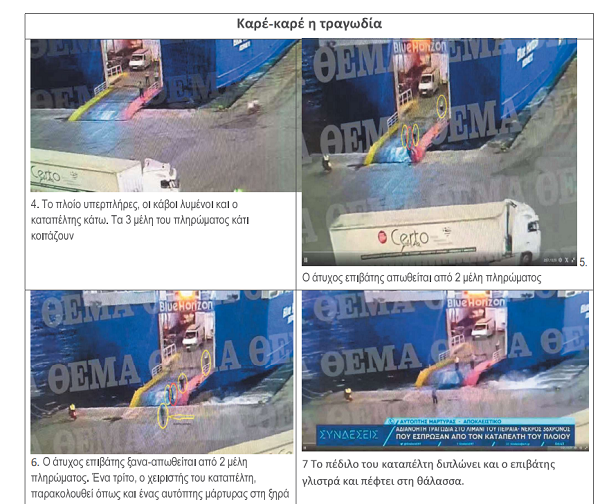 Πού είναι ο έλεγχος του πλοίου από τον πλοίαρχο του; Καλά οι άνθρωποι του στον καταπέλτη, θέλω να πιστεύω, δεν του είπαν, αυτός δεν είχε εικόνα από τις κάμερες που έχουν τοποθετηθεί γι’ αυτόν τον σκοπό; Πού είναι η υπευθυνότητα, ο επαγγελματισμός και η ανθρωπιά του πλοιάρχου, που ενώ αρκετοί επιβάτες, όπως καταθέτουν, τον ενημέρωναν για το συμβάν, αυτός κώφευε;