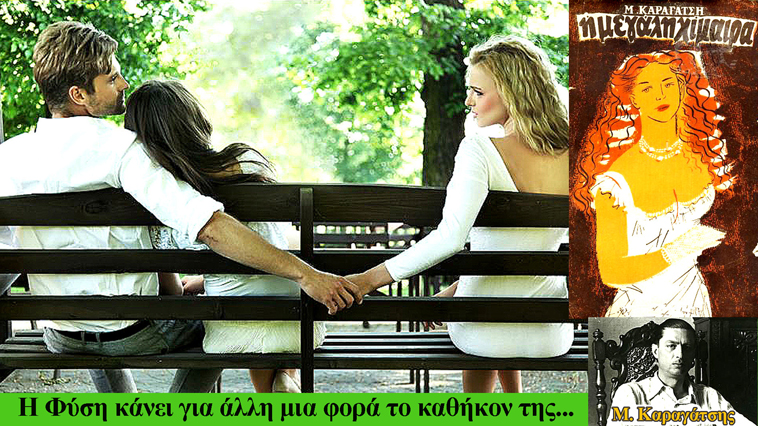 Λυτρώθηκα κυριολεκτικά, όταν διάβασα “κάτι” στον “επαναστάτη” Μ. Καραγάτση, στη ΜΕΓΑΛΗ ΧΙΜΑΙΡΑ. Θα μπορούσα να σας παρακαλέσω …γονυπετής (sic), να το διαβάσετε τρεις φορές! «Η Μήδεια είναι ο φυσιολογικός άνθρωπος, που το ερωτικό πάθος, τού συσκοτίζει το λογικό, όπως στον κάθε φυσιολογικό άνθρωπο. Κατ’ αντιδιαστολήν συμπέρασμα: ο άνθρωπος που δεν μπορεί να νιώσει ένα τέτοιο πάθος, δεν είναι φυσιολογικός» (Η ΜΕΓΑΛΗ ΧΙΜΑΙΡΑ, σελ. 43, στην έκδοση ΕΣΤΙΑ). (Και η φύση-θεός, μπορεί να τον τιμωρήσουν με κάνα …καρκίνο στον εγκέφαλο! Έχουμε οικογενειακό παράδειγμα…).
