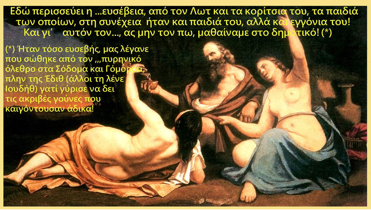 Λέω να ρίξω ένα “καρφί”, με κάποιο συμβάν από τους θριάμβους της φύσης, που σχετίζεται με το ένστικτο της διαιώνισης. Η ανίκητη φύση-θεός, λοιπόν “ανάγκασε” τον Λωτ (επειδή η Έδιθ είχε μαρμαρώσει), να γκαστρώσει τις δύο κόρες του (Βίβλος, Γέν. 19-16)! Και η Παλαιά Διαθήκη, όχι μόνο δε μιλάει για αμαρτία, αλλά έχει την πράξη αυτή σαν “λάβαρο”, αφού αυτή ήταν η επιθυμία του θεού, (της φύσης). Η Βίβλος είναι γεμάτη με …ευλογημένες από τον θεό, αιμομιξίες! Ψάξτε, αλλά προσοχή στις “πηγές”! Και μην ξεχνάτε καθόλου, ότι «άλλο σύζυγος και άλλο εραστής».