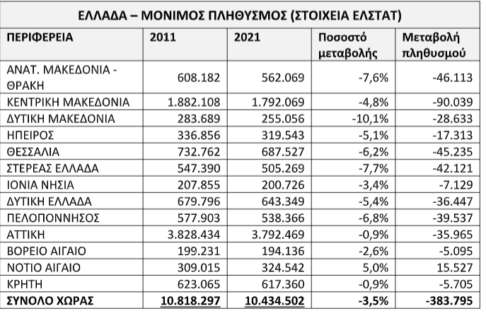 Πριν από λίγες ημέρες δημοσιεύτηκαν από την ΕΛΣΤΑΤ τα προσωρινά αποτελέσματα από την απογραφή πληθυσμού, που έγινε το 2021. Σύμφωνα με αυτά, στη δεκαετία 2011-2021 ο μόνιμος πληθυσμός της Ελλάδας μειώθηκε κατά 3,5% ή σε απόλυτους αριθμούς κατά 383 χιλιάδες, φθάνοντας τα 10,4 εκατομμύρια. Τα παραπάνω αποτελέσματα δεν συνιστούν έκπληξη. Στην πραγματικότητα επικυρώνουν την εικόνα που προκύπτει από τα στοιχεία γεννήσεων-θανάτων που δημοσιεύει η ΕΛΣΤΑΤ κάθε χρόνο.