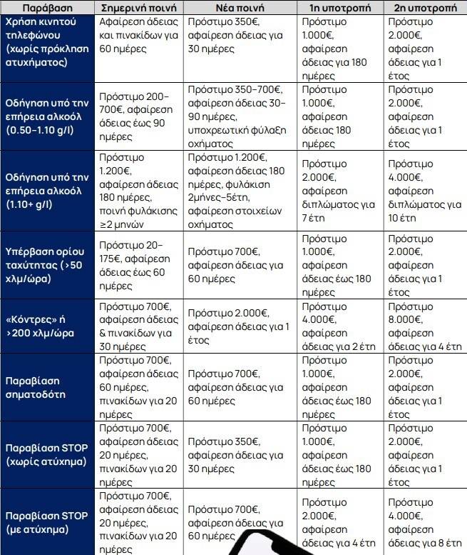 Επομένως, στις ανωτέρω ήδη ισχύουσες περιπτώσεις, προστίθενται η χρήση κινητού τηλεφώνου και η παραβίαση STOP, ενώ αξιοσημείωτο είναι ότι η εγκατάλειψη θύματος τροχαίου αναβαθμίζεται από πλημμέλημα του αρ. 306 ΠΚ (με επαπειλούμενη ποινή φυλάκισης από 6 μήνες έως 5 έτη) σε κακούργημα (με επαπειλούμενη ποινή κάθειρξης).