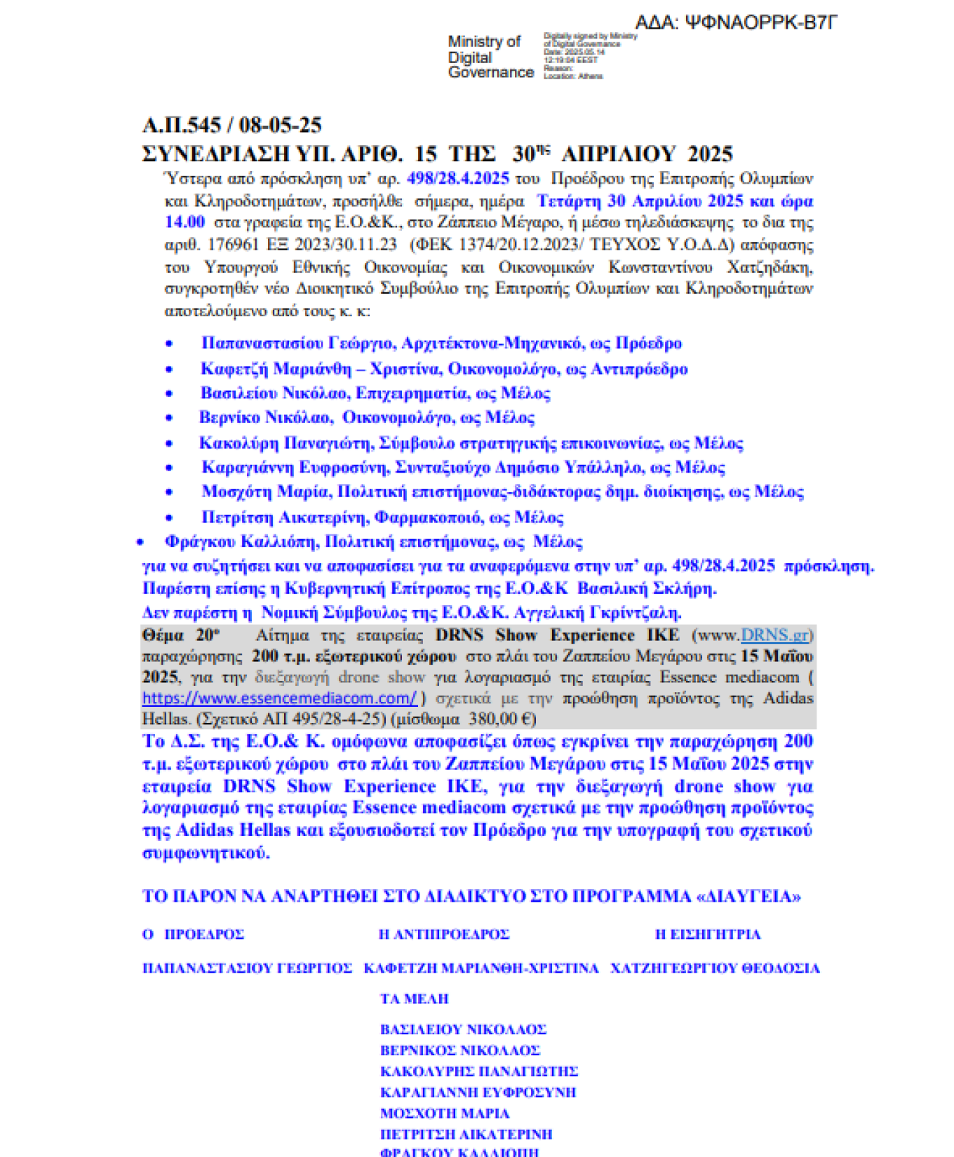 Σύμφωνα με την ίδια την εταιρεία, η διοίκηση του Ζαππείου Μεγάρου παραχώρησε την σχετική άδεια σε γνωστή εταιρεία αθλητικών ειδών για διεξαγωγή του drone show, χθες βράδυ, στον αττικό ουρανό, με φόντο την Ακρόπολη, το οποίο προκάλεσε πλήθος αντιδράσεων. Όπως προκύπτει από τη σχετική απόφαση που δημοσιεύθηκε προχθές στη Διαύγεια, η εταιρεία κατέθεσε το αίτημα στις 30 Απριλίου και το διοικητικό συμβούλιο της αρμόδιας Επιτροπής Ολυμπίων Κληροδοτημάτων, η οποία εποπτεύεται από το υπουργείο Εθνική Οικονομίας και Οικονομικών, αποφάσισε ομόφωνα, να εγκριθεί η παραχώρηση 200 τ.μ. εξωτερικού χώρου στο πλάι του Ζαππείου Μεγάρου, στις 15 Μαΐου 2025, για τη διεξαγωγή drone show για λογαριασμό της εταιρίας Essence mediacom σχετικά με την προώθηση προϊόντος της Adidas Hellas, έναντι μισθώματος ύψους μόλις 380 ευρώ.