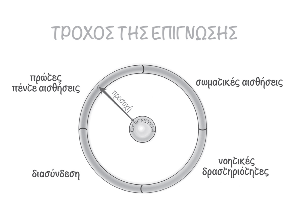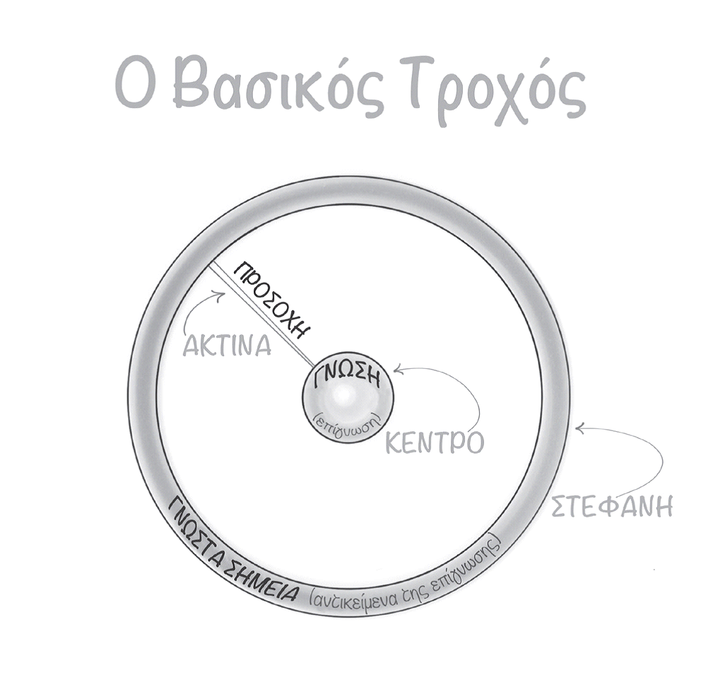 Σκέψου τη συνειδητότητά σου σαν έναν κύκλο: Η στεφάνη αντιπροσωπεύει τα ερεθίσματα του περιβάλλοντος και τις αντιδράσεις σου –σωματικές ή συναισθηματικές– σε αυτά. Η ακτίνα την προσοχή σου, την ικανότητά σου να εστιάζεις κάθε φορά σε κάποια σκέψη, εικόνα, αίσθηση ή σε κάποιο συναίσθημα από μια μεγάλη γκάμα όλων αυτών που βρίσκονται στη στεφάνη γύρω σου. Η επίγνωση είναι η γνώση σου για το σε ποιο σημείο της στεφάνης στρέφεις κάθε φορά την ακτίνα-προσοχή σου.