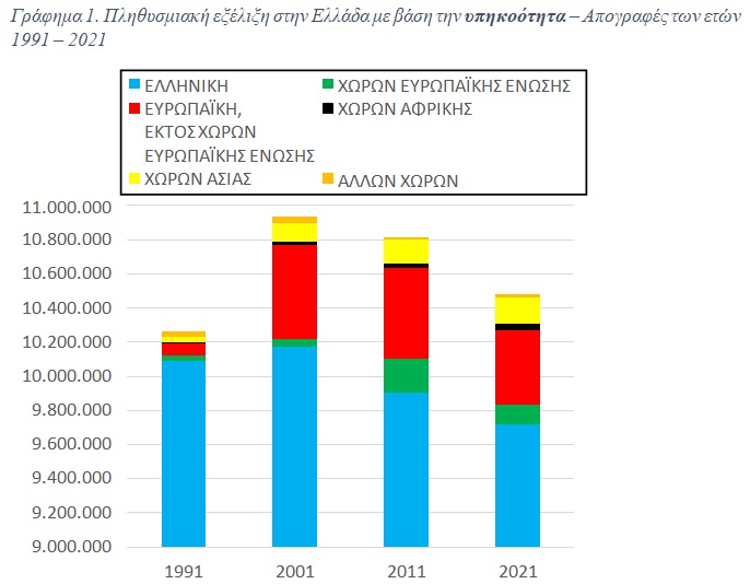 Μόλις δέκα χρόνια μετά η δημογραφική εικόνα της χώρας άλλαξε ριζικά: Στην Ελλάδα κατοικούσαν 10.934.097 μόνιμοι κάτοικοι, με τους Έλληνες να αποτελούν το 93% (10.171.906) του πληθυσμού. Οι υπήκοοι των χωρών μελών της Ευρωπαϊκής Ένωσης ανέρχονταν στο 0,4% (46.869) και οι υπήκοοι τρίτων χωρών στο 6,5% (715.322). Ο δε αριθμός των Αλβανών υπηκόων αυξήθηκε στους 438.036 μονίμους κατοίκους (4% του συνολικού πληθυσμού). Συνολικά ο αριθμός των αλλοδαπών το 2011 ανερχόταν στο 8,4% (912.000) και το 2021 στο 7,3% (765.598). Ο αριθμός των Ελλήνων υπηκόων το 2021 (9.716.889) μειώθηκε σε σχέση με το 2001 κατά 2,6% (9.904.286) και σε σχέση το 2011 κατά 4,5% (9.716.889).