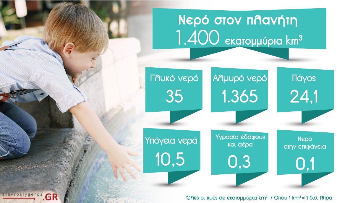 Η γεωγραφία του νερού μας δείχνει ότι το 71% της επιφάνειας της Γης καλύπτεται από νερό (σε συνολικά 510 εκατομμύρια τετραγωνικά χιλιόμετρα επιφάνειας, τα 364 καλύπτονται από νερό. Tο 97,5% από αυτό είναι αλμυρό. Από το υπόλοιπο 2,5% μόνο το 1% είναι χρησιμοποιήσιμο για τις ανθρώπινες ανάγκες (το υπόλοιπο βρίσκεται υπό τη μορφή πάγων) και μόνο το 0,3% είναι πόσιμο.