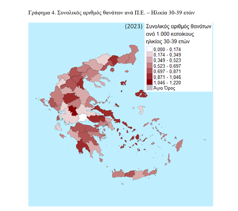 Όσον αφορά την ηλικιακή ομάδα των 30 έως 39, ο μέσος όρος θνησιμότητας ανέρχεται στους 0,61 θανάτους ανά 1.000 κατοίκους. Ιδιαίτερα υψηλή θνησιμότητα εμφανίζουν οι Π.Ε. Ευρυτανίας, Μεσσηνίας, Εύβοιας, Λέσβου & Λήμνου, Βοιωτίας κ.α. Σε σχέση με την ηλικιακή κατηγορία των 40 έως 29 ετών ο μέσος όρος θνησιμότητας ανέρχεται στους 1,46 θανάτους ανά 1.000 κατοίκους. Οι Π.Ε. με την υψηλότερη θνησιμότητα είναι οι Π.Ε. Δυτικής Αττικής, Νήσων Αττικής, Μαγνησίας & Σποράδων, Ροδόπης, Πέλλας κ.α. Ο μέσος όρος θνησιμότητας της ηλικιακής ομάδας των 50 έως 59 ετών είναι 3,99 ανά 1.000 κατοίκους με τις Π.Ε. Φθιώτιδας, Βοιωτίας, Ημαθίας, Λασιθίου, Κορίνθου κ.α. να κατέχουν από τις υψηλότερες θέσεις.