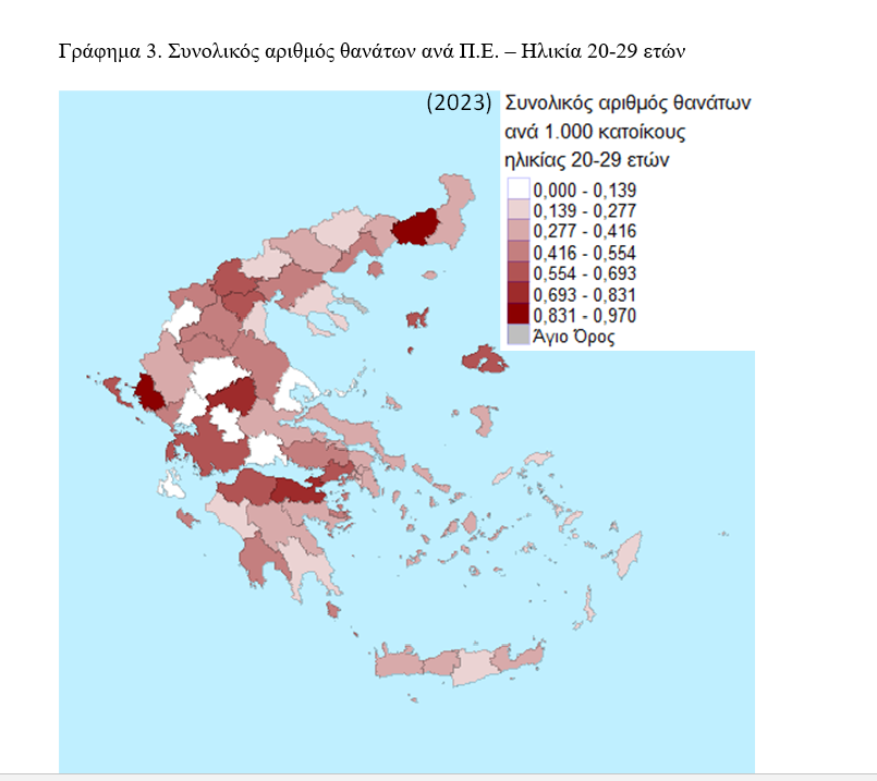 Ο μέσος όρος θνησιμότητας στην ηλικιακή ομάδα των 20 έως 29 ετών ανέρχεται στους 0,39 θανάτους ανά 1.000 κατοίκους. Ο 20 Π.Ε. με την υψηλότερη θνησιμότητα είναι οι Π.Ε. Θεσπρωτίας, Ροδόπης, Κορίνθου, Καρδίτσας, Δυτικής Αττικής, Αιτωλοακαρνανίας, Λέσβου και Λήμνου, Ημαθίας, Αχαΐας, Πέλλας, Κέρκυρας, Νήσων Αττικής, Ζακύνθου, Λάρισας, Βοιωτίας, Μεσσηνίας, Πειραιά, Πρέβεζας και Κοζάνης.