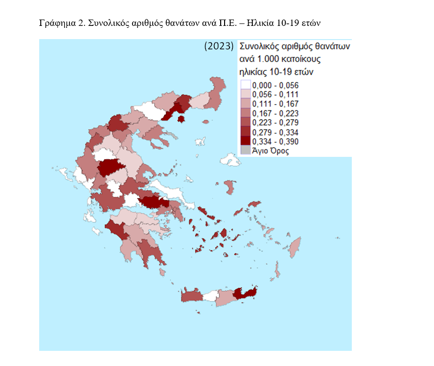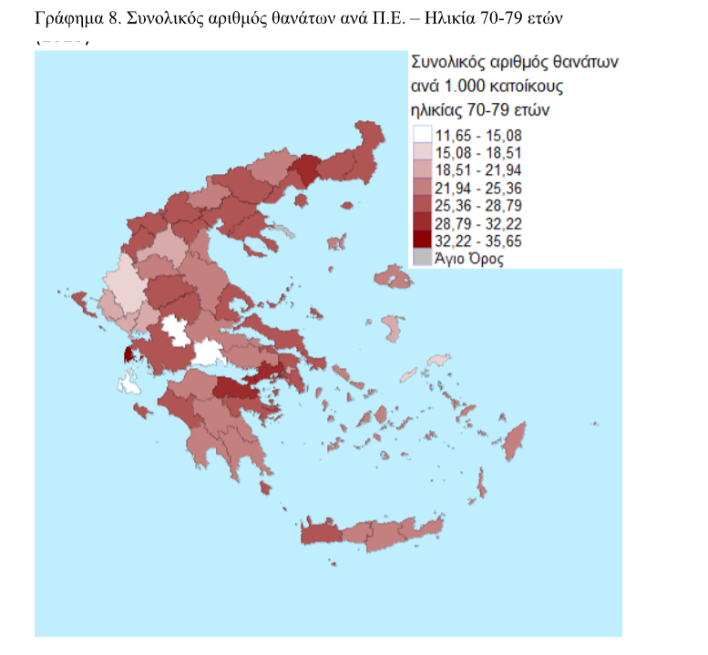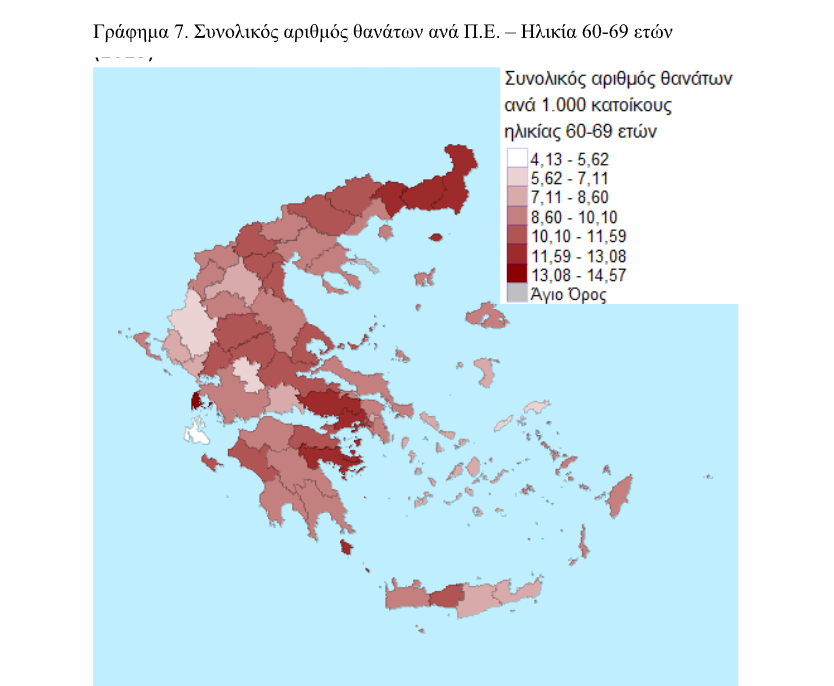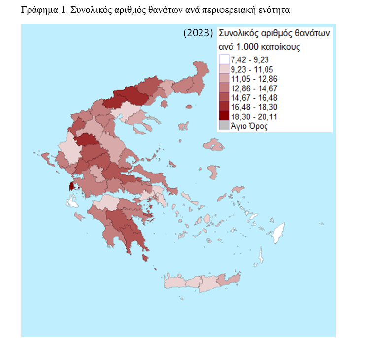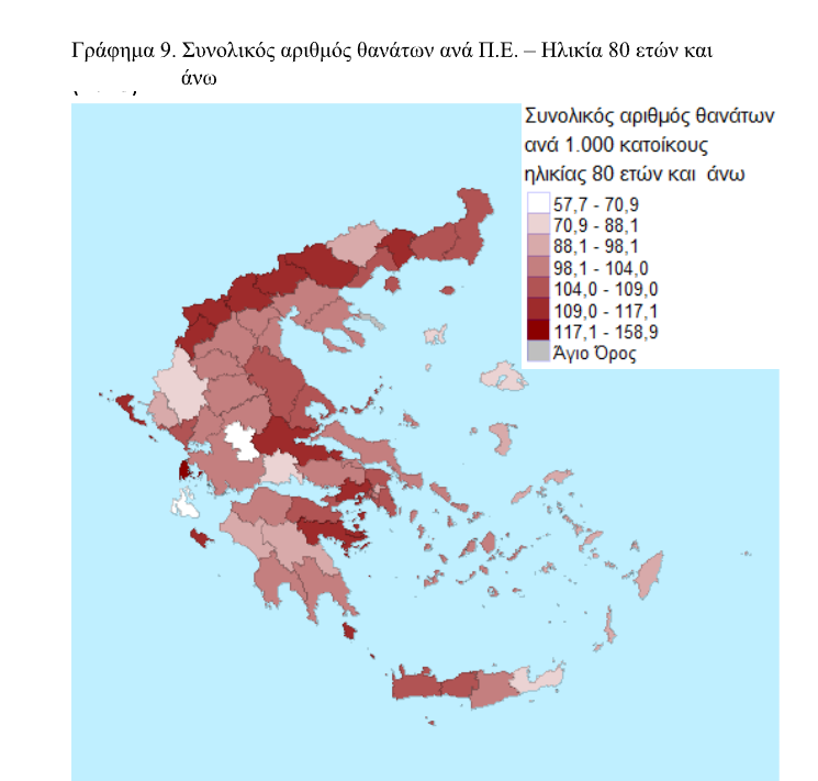 Δέκα Π.Ε. εμφανίζουν έναν αριθμό θανάτων που κυμαίνεται ανάμεσα στους 9,23 έως 11,05 θανάτους ανά 1.000 κατοίκους. Τον χαμηλότερο αριθμό θανάτων εμφανίζουν τα Δωδεκάνησα και η Π.Ε. Ιθάκης/Κεφαλληνίας. Τέλος, στο Γράφημα 1 εμφανίζεται το Άγιο Όρος με γκρίζο χρώμα. Λόγω του αυτοδιοίκητου του Αγίου Όρους δεν υπάρχουν από την ΕΛΣΤΑΤ καταχωρημένα στοιχεία σχετικά με τον αριθμό των θανάτων.