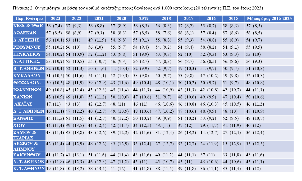 Βλέπουμε λοιπόν, πως η κατάταξη των Π.Ε. σε σχέση με την υψηλή θνησιμότητα το 2023 σχετίζεται με την κατάταξη τους στα προηγούμενων έτη. Το ίδιο ισχύει και για τις Π.Ε. με χαμηλή θνησιμότητα, όπως φαίνεται καθαρά στον Πίνακα 2. Το 2023 η Περιφερειακή Ενότητα Κεφαλληνίας & Ιθάκης βρίσκεται στην τελευταία θέση (58η) θνησιμότητας με 7,4 θανάτους ανά 1.000 κατοίκους. Τα έτη 2015-2023 ο μέσος όρος θανάτων αυτής της Π.Ε. ανέρχεται στους 8,5 θανάτους ανά 1.000 κατοίκους και καταλαμβάνει την 57η θέση στον πίνακα θνησιμότητας. Ομοίως, η Π.Ε. του πρώην νομού Δωδεκανήσου βρίσκεται στην 57η θέση το 2023 και στην 58η θέση με βάση τον μέσο όρο θανάτων ανά 1.000 κατοίκους, την περίοδο 2015-2023.