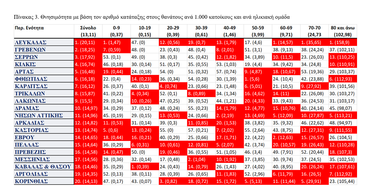 Οι 20 πρώτες Π.Ε. με θνησιμότητα σημαντικά υψηλότερη του μέσου όρου εμφανίζονται με κόκκινο υπόβαθρο. Για παράδειγμα, η Λευκάδα βρίσκεται συνολικά στην υψηλότερη (1) θέση από άποψη θνησιμότητας με 20,11 θανάτους ανά 1.000 κατοίκους. Ο μέσος όρος θνησιμότητας στο σύνολο του πληθυσμού της χώρας είναι, όπως προαναφέρθηκε, 13,11 ανά 1.000 κατοίκους. Για αυτό τον λόγο η τιμή θνησιμότητας της Λευκάδας είναι με κόκκινο υπόβαθρο.