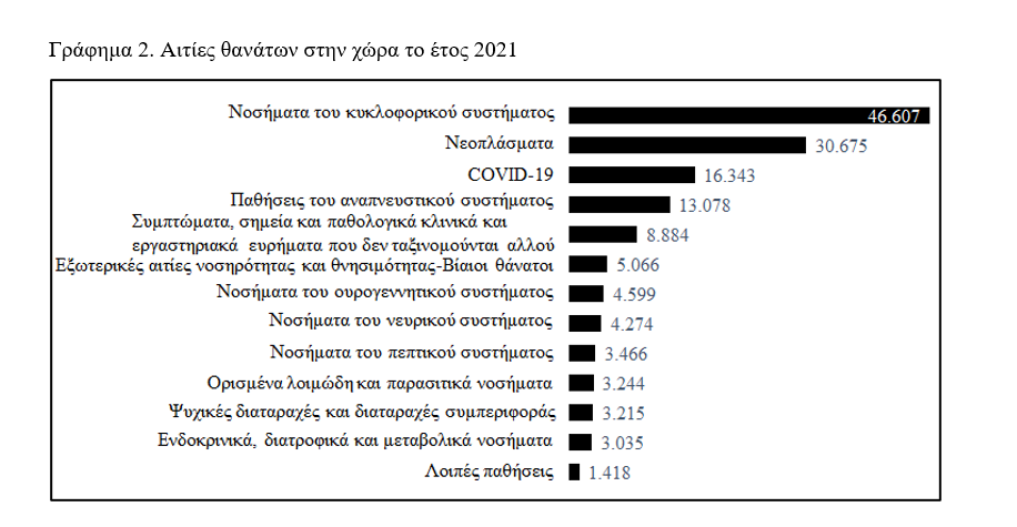 Τα στοιχεία αυτά παρουσιάζονται στο Γράφημα 2. Η συχνότερη αιτία θανάτων για το έτος 2021 με 32,4% (46.607) αφορούσε νοσήματα του κυκλοφορικού συστήματος όπως εγκεφαλικά και καρδιακά νοσήματα. Οι καρκίνοι αποτελούσαν με 21,3% (30.675) την δεύτερη συχνότερη αιτία θανάτων το 2021. Στην τρίτη θέση με 11,4% (16.343) βρισκόταν οι θάνατοι από COVID-19. Ένα 3,5% (5.066) των θανάτων οφειλόταν σε δυστυχήματα και ανθρωποκτονίες.