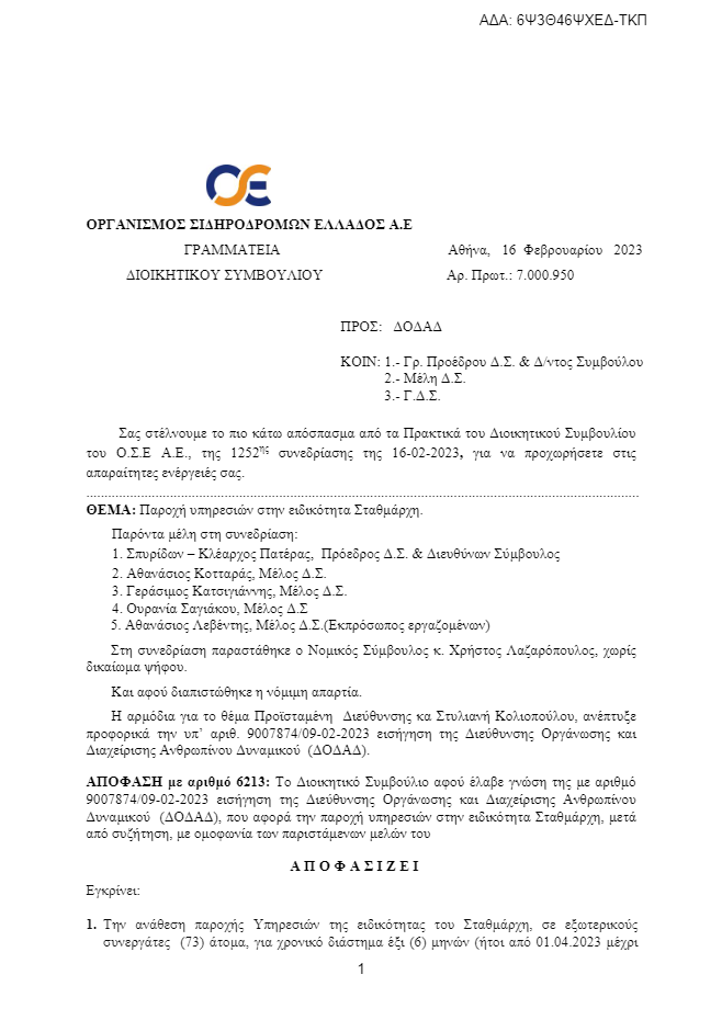 Η απόφαση ελήφθη στις 16 Φεβρουαρίου από το Διοικητικό Συμβούλιο του ΟΣΕ και σύμφωνα με όσα αναφέρονται το ΔΣ ενέκρινε την ανάθεση παροχής Υπηρεσιών της ειδικότητας του Σταθμάρχη σε εξωτερικούς συνεργάτες (73) άτομα για χρονικό διάστημα έξι μηνών, οι οποίοι θα απασχοληθούν σε όλο το σιδηροδρομικό δίκτυο.