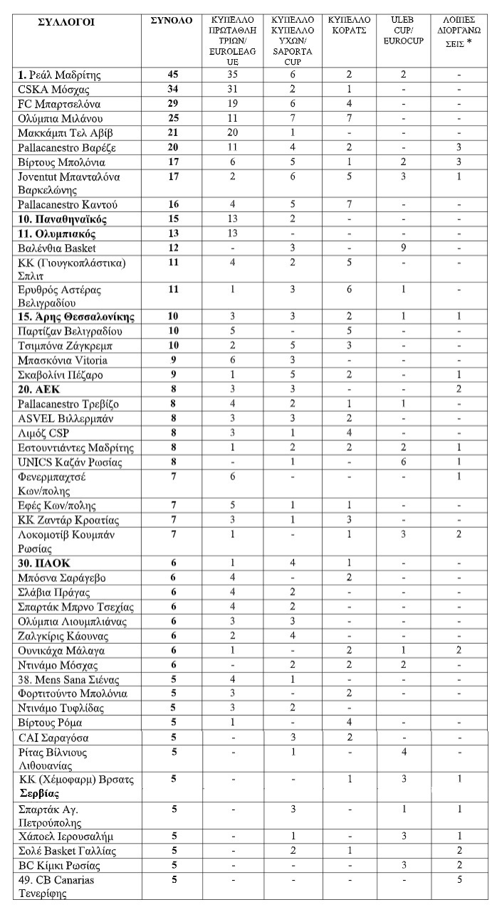 *Λοιπές διοργανώσεις: FIBA Basketball Champions League, FIBA Europe Cup, FIBA EuroChallenge, FIBA EuroCup Challenge