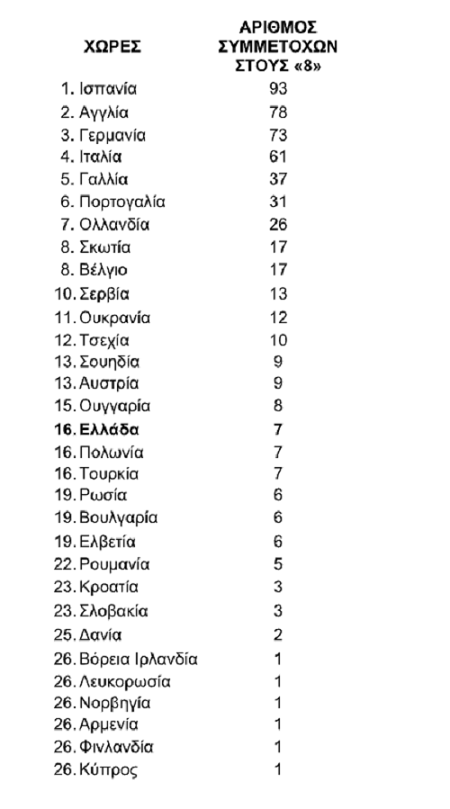 Η Κύπρος, η Αρμενία και η Φινλανδία έχουν ομάδα στην προημιτελική φάση του Champions League. Η Ελλάδα είναι στη 16η θέση – με 7 συμμετοχές στην οκτάδα του Κυπέλλου Πρωταθλητριών – μαζί με την Πολωνία και την Τουρκία, και μπροστά από τη Ρωσία (6), τη Ρουμανία (5) και την Κροατία (3). Οι τέσσερις ισχυρότερες χώρες σε επίπεδο συλλόγων προηγούνται με διαφορά στη σχετική κατάταξη. Η Ισπανία είναι στην πρώτη θέση με 15 προκρίσεις περισσότερες από τη δεύτερη Αγγλία (78). Την πρώτη τετράδα συμπληρώνουν η Γερμανία (73) και η Ιταλία (61). Τα σωματεία της Πορτογαλίας έχουν περισσότερες συμμετοχές (31) στους “8” του Κυπέλλου Πρωταθλητριών από αυτά της Ολλανδίας (26). Η Σκωτία, που σε παλαιότερες δεκαετίες είχε ισχυρούς συλλόγους, βρίσκεται στην 8η θέση μαζί με το Βέλγιο.