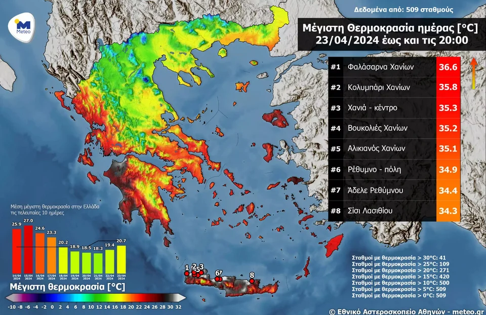 Σύμφωνα με τους μετεωρολόγους το αβαθές χαμηλό στην περιοχή της Σύρτης, κινούμενο προς την Ελλάδα, μετέφερε πολύ μεγάλες ποσότητες αφρικανικής σκόνης, δυσχεραίνοντας κατά πολύ την ποιότητα του αέρα, συνθέτοντας ένα απόκοσμο σκηνικό με κόκκινο ουρανό.Πολύ υψηλές θερμοκρασίες σημειώθηκαν σε περιοχές της Νότιας Ελλάδας και κυρίως στην Κρήτη, όπου στα Φαλάσαρνα Χανίων καταγράφηκε και η μεγαλύτερη θερμοκρασία, με τιμή 36,6°C.