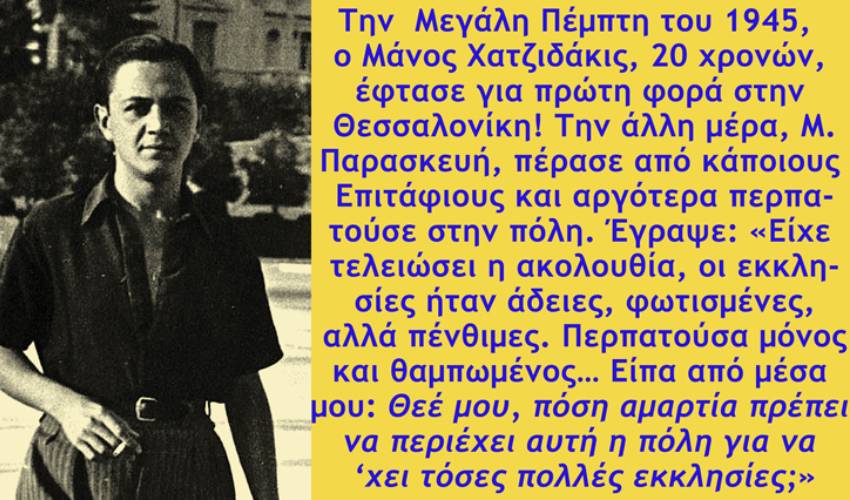 Όμως, άλλες είχαν πάει στην πατρίδα τους, άλλες δεν θέλανε κι άλλες είχαν κανονίσει… Απελπισία μεγάλη, γιατί δεν έβρισκε ούτε φίλο, για παρεΐστικο καμάκι στην Εγνατία (κι εμείς δεν τον πολυγουστάραμε…) Τελικά, απογοητευμένος, πήγε μόνος του στον Επιτάφιο της Μητρόπολης, στο ναό του Αγ. Γρηγορίου Παλαμά, που είχε πολύ τζέρτζελο και μεγάλη περιφορά! Με ένα κερί στο χέρι και καλοντυμένος (ενορία αστών, γαρ-γαρ…), έψαχνε για μοναχικό κορίτσι, βαδίζοντας “οφιοειδώς” ανάμεσα στο πλήθος. Τελικά μπάνισε κάποιο, με σκούρα ρούχα, που φαινόταν στενοχωρημένο κι αυτό τον φούντωνε, γιατί έβλεπε τον εαυτό του να κάνει τον παρηγορητή.