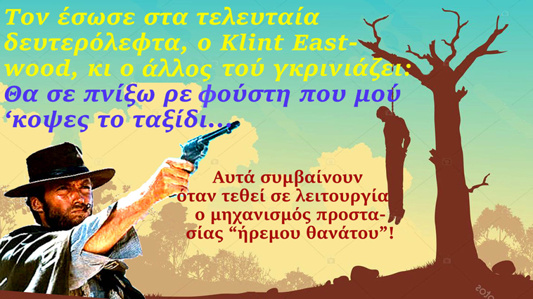 Ο πολύπλευρος Σουηδός Tomas Gösta Tranströmer, ψυχαναλυτής ποιητής, μεταφραστής και φυσιολάτρης, τον οποίον έτυχε να συναντήσω σε ιδιωτική γιορτή στη Στοκχόλμη, μου είπε ότι «Ο οπαδός, είναι σε μεγαλύτερο ποσοστό πιθανός δολοφόνος, από τον μέσο άνθρωπο που δεν είναι οπαδός». Το θέμα μού θυμίζει ένα φαινόμενο το οποίο έχει παρατηρηθεί και καταγραφεί. Προσέξτε! Αν έχουν κρεμάσει κάποιον και λίγα δευτερόλεπτα πριν τα τινάξει, εμφανιστεί… σωτήρας και κόψει το σκοινί του, αυτός βάζει αυτόματα τα χέρια του στο λαιμό του, για να… συνεχιστεί το κρέμασμα!Γιατί; Γιατί μερικά(;) δευτερόλεπτα μετά τον απαγχονισμό, υποχωρεί η “αυτοσυντήρηση”, ως ένστικτο, και μπαίνει σε λειτουργία ο μηχανισμός “συμφιλίωσης” με τον επικείμενο θάνατο! Ένα καλό παράδειγμα είναι ο ελέφαντας, που όταν αντιλαμβάνεται το τέλος του, πηγαίνει κάπου, για να είναι μόνος του! Το ένα φέρνει τ’ άλλο και κάποια φορά (όταν έμενα στη Θεσσαλονίκη) διαβάσαμε στις εφημερίδες ότι κάποιος ναυτικός κρεμάστηκε στο καμαρίνι του, σ’ ένα εμπορικό καράβι αραγμένο στο λιμάνι της πόλης. Το καταπληκτικό, που δεν είχαμε ξανακούσει, ήταν ότι αυτός είχε κατασκευάσει έναν μηχανισμό να “κρεμιέται” κι όταν ερχόταν η στιγμή της εκσπερμάτωσης (συμβαίνει στον απαγχονισμό, καθώς και άλλες “εκκρίσεις”) τραβούσε ένα κορδόνι για να μην πνιγεί. Φαίνεται όμως ότι εκείνη τη μοιραία φορά, λειτούργησε νωρίτερα, το “ευεργετικό” ένστικτο θανάτου που λέγαμε…