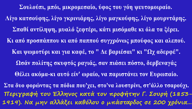 Η γυναίκα του, το βεβαίωσε και έδειξε την ανάληψη από την τράπεζα την ίδια μέρα με το περιστατικό! Αντιστάθηκε, τον χτύπησαν άσχημα, και το χειρότερο ήταν ότι υπέστη σοβαρότατες κρανιοεγκεφαλικές κακώσεις, μη αναστρέψιμες… Τον ανέλαβε κάποιος «Οίκος», έναντι 1.200 € το μήνα! «Ανήθικο» δίδαγμα: Και οι «ηλίθιοι», μπορεί κάποια φορά να ξυπνήσουν… Μην το συζητάτε, τα πάντα εν σοφία εποίησεν! (Και για δες, που θυμήθηκα τον συμπαθέστατο Καραϊβάζ, που ακόμα «κουνιέται», στον τάφο του, για δικαίωση!)