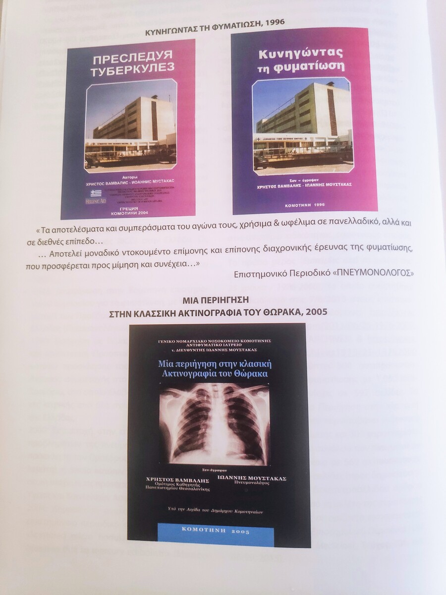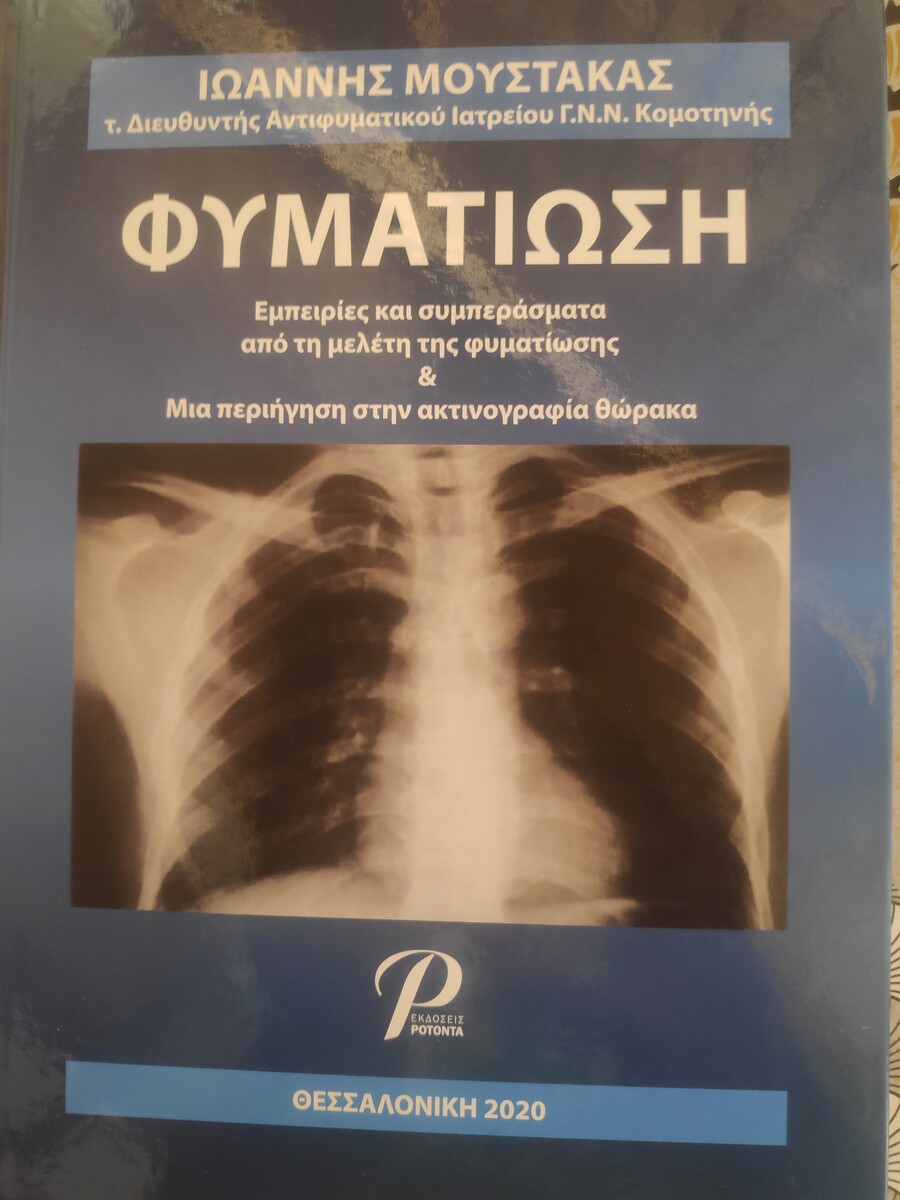 Το βιβλίο “Φυματίωση: Εμπειρίες και συμπεράσματα από την μελέτη της φυματίωσης – Μια περιήγηση στην ακτινογραφία θώρακα” εκδόσεις Ιπποκράτης κυκλοφόρησε το 2020 και γίνεται επίκαιρο όσο ποτέ αποτυπώνοντας πάνω από 2000 περιστατικά, 32.055 φυματιω-αντιδράσεις, 17.009 εμβολιασμούς Β.C.G. αντιμετωπίζοντας νοσηρότητα, διαμόλυνση, ενδονοσοκομειακή οικιακή νοσηλεία, τη φυματική πρώτο μόλυνση, τη διερεύνηση τη φυματική διαμόλυνση, αποτυχίες, υποτροπές, θανάτους, μεταφυματιδιώδεις αλλοιώσεις, καρκινώματα σε ουλή κ.α. ενώ γίνονται αναλυτικές αναφορές στην χειμειοπροφύλαξη για την πρόληψη της νόσου, τα συμπεράσματα αντιμετώπισης της με στόχο την εκρίζωση.