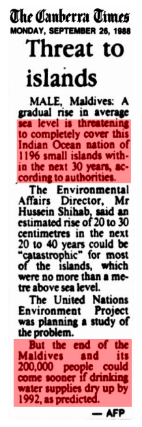 1988: Οι Μαλδίβες θα εξαφανισθούν κάτω από τόνους νερού μέχρι το 2018. Σημειώνεται ότι οι Μαλδίβες είναι ακόμη εκεί, χτίζονται 5 νέα αεροδρόμια και επενδύονται δεκάδες εκατομμύρια δολάρια σε ξενοδοχεία.
