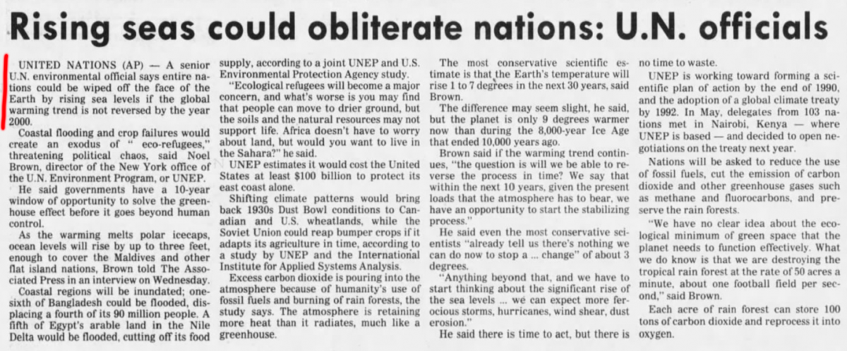 1989: Η ανύψωση του επιπέδου της θάλασσας θα εκμηδενίσει/εξαφανίσει έθνη αν δεν γίνει κάτι μέχρι το 2000.