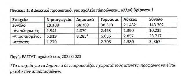 Το σχολικό έτος 2022/2023 (τελευταία στοιχεία) οι αποσπασμένοι και οι απόντες εκπαιδευτικοί στην πρωτοβάθμια και δευτεροβάθμια εκπαίδευση ανέρχονταν σε περίπου 30.000 επί συνόλου 143.302 εκπαιδευτικών!