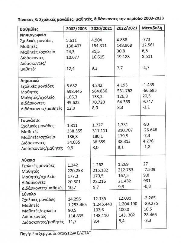 Ακόμα, από τους άλλους δύο παρατιθέμενους πίνακες προκύπτουν μερικές άλλες διαπιστώσεις, τις οποίες πρέπει να μελετήσουν οι εκπρόσωποι των εκπαιδευτικών: η επίμονη επισήμανση κάθε έναρξη σχολικού έτους για χιλιάδες κενά και κάλυψή τους με προσλήψεις (οι οποίες πραγματοποιούνται με αντίστοιχες προσλήψεις χιλιάδων αναπληρωτών, είναι προκλητική τη στιγμή που σε μια εικοσαετία παρατηρείται μείωση των μαθητών κατά 90.000 περίπου (με τον μαθητικό πληθυσμό ανά σχολείο να είναι σε απογοητευτικά επίπεδα στις αγροτικές περιοχές) και αύξηση των εκπαιδευτικών κατά 28.466 με την εμφάνιση (μόνο στατιστικώς βεβαίως!) μάλιστα σχέσης μαθητών προς διδάσκοντα σε επίπεδα χαμηλότερα ακόμα κι από το αντίστοιχο της Ευρωπαϊκής Ένωσης!