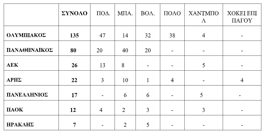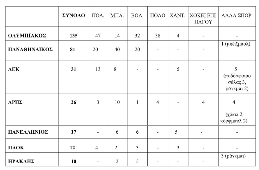 Η παρακάτω ανάλυση αναφέρεται στους επτά κορυφαίους αθλητικούς συλλόγους της χώρας σε επίπεδο ανδρών στα ομαδικά σπορ, με βάση τις κατακτήσεις πρωταθλημάτων, δηλαδή των τριών μεγαλύτερων συλλόγων της Αθήνας και της Θεσσαλονίκης, αλλά και του Πανελλήνιου.