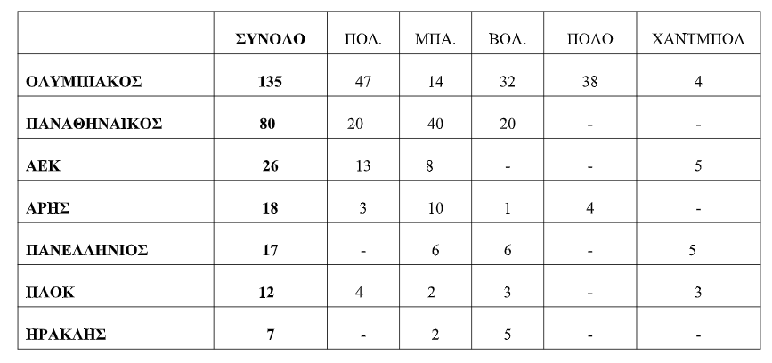 ΤΑ ΠΡΩΤΑΘΛΗΜΑΤΑ ΤΩΝ ΕΠΤΑ (7) ΚΟΡΥΦΑΙΩΝ ΕΛΛΗΝΙΚΩΝ ΣΥΛΛΟΓΩΝ ΣΕ ΟΛΑ ΤΑ ΟΛΥΜΠΙΑΚΑ ΚΑΙ ΜΗ ΟΛΥΜΠΙΑΚΑ ΟΜΑΔΙΚΑ ΣΠΟΡ (ΑΝΔΡΕΣ)