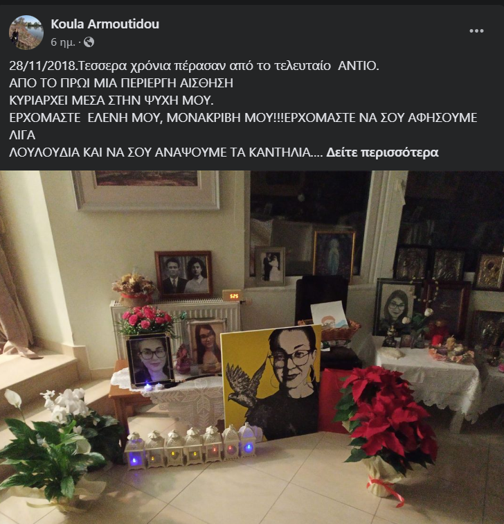 Τρεις μόνο ημέρες μετά, 28 Νοεμβρίου, η μητέρα της Ελένης Τοπαλούδη, Κούλα Αρμουτίδου, με ανάρτησή της στα μέσα κοινωνικής δικτύωσης υπενθύμισε ότι κλείνουν τέσσερα χρόνια από το τελευταίο αντίο, με μία φωτογραφία από το σαλόνι του σπιτιού της στις 05:24 τα χαράματα ακριβώς: Κάμερα και φωτεινός ωροδείκτης πάνω στο τραπεζάκι είναι απολύτως συγχρονισμένα. Φωτογραφίες της Ελένης, φαναράκια αναμμένα, δύο κόκκινα αλεξανδρινά, λευκό κυκλάμινο και σπαθίφυλλο. Όλα σε απόλυτη τάξη και καθαριότητα…