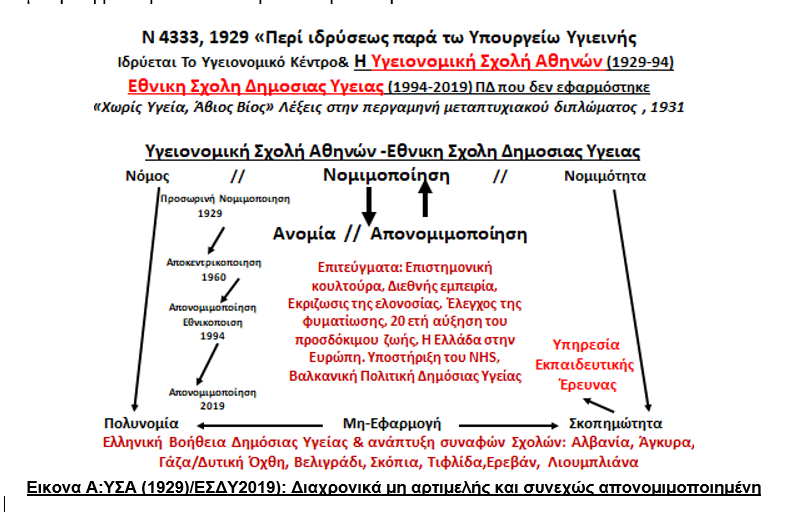 Γίνεται σαφές ότι η ελίτ της Ελλάδας δεν θεωρούσε τη μοναδική Εθνική Σχολή Δημόσιας Υγείας αξιοσήμαντη, ούτε και μέρος της πολιτιστικής κληρονομιάς, πράγμα που επέτρεψε στους πολιτικούς “να τη σκοτώσουν”. Με τόσους πολλούς πολιτικούς, από τον Γεννηματά έως τον Κατρούγκαλο, όπως και δημοσιογράφους κ.ά., ορισμένοι εκ των οποίων έχουν ασχοληθεί με την ΥΣΑ-ΕΣΔΥ, το ζήτημα του ανόητου κλεισίματός της δεν μπορεί να χαρακτηριστεί ως ένα εθνικό “τυφλό σημείο”, και εκεί ακριβώς έγκειται η τραγωδία. Με την πάροδο του χρόνου, η Σχολή αυτή παρέμενε ελλιπής και συνεχώς υπονομευόταν, αλλά, παραδόξως, λειτουργούσε τόσο εκπαιδευτικά, όσο και ερευνητικά, αλλά και υπηρεσιακά.