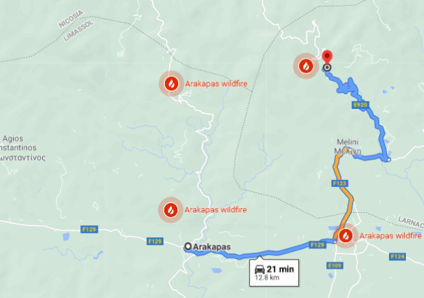 Το ορεινό χωριό Οδού όπου κάηκαν οι εργάτες γης απείχε σε ευθεία 5-6 χιλιόμετρα από την αρχική εστία της φωτιάς, αλλά η απόσταση αυτή καλύφθηκε αστραπιαία καθώς οι φλόγες σκαρφάλωναν στα βουνά με την βοήθεια των ανέμων. Οι εργάτες γης πιθανόν και να πανικοβλήθηκαν γιατί ο δρόμος (η γαλάζια διαδρομή) από τον οποίο θα μπορούσαν να διαφύγουν είχε ήδη σκεπαστεί από καπνούς και πήραν την απόφαση να κινηθούν προς την αντίθετη κατεύθυνση, δηλαδή να πάνε πιο ψηλά. Το χωριό Οδού βρίσκεται στα 850 μέτρα ενώ η φωτιά ξεκίνησε από τον Αραπακά που βρίσκεται σε υψόμετρο 650 μ. Ο Αραπακάς με τη σειρά του βρίσκεται (σε ευθεία) σε απόσταση 15 χλμ. από την Λεμεσό.