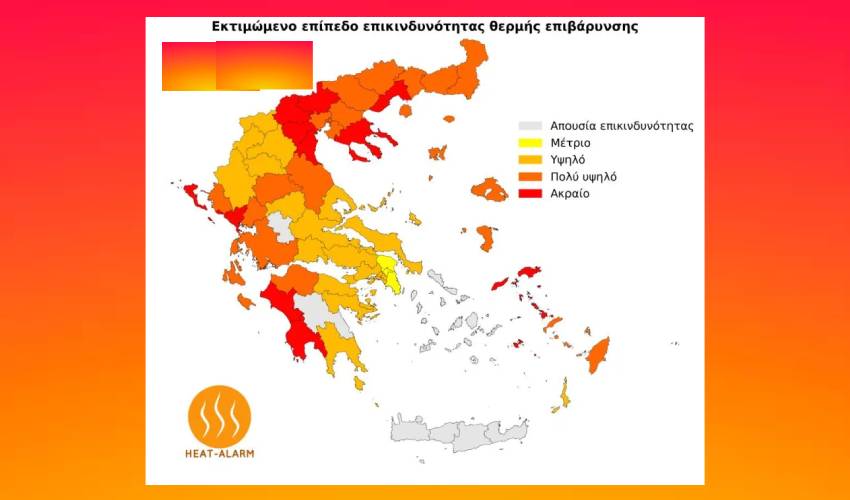 Σύμφωνα με τις τελευταίες διαθέσιμες εκτιμήσεις του συστήματος HEAT-ALARM, αυξημένη επικινδυνότητα λόγω θερμής επιβάρυνσης αναμένεται σήμερα, Πέμπτη 11 Ιουλίου 2024 σε βόρεια, κεντρικά και δυτικά τμήματα της ηπειρωτικής και νησιωτικής Ελλάδας, όπως και σε νησιά του Ανατολικού Αιγαίου.