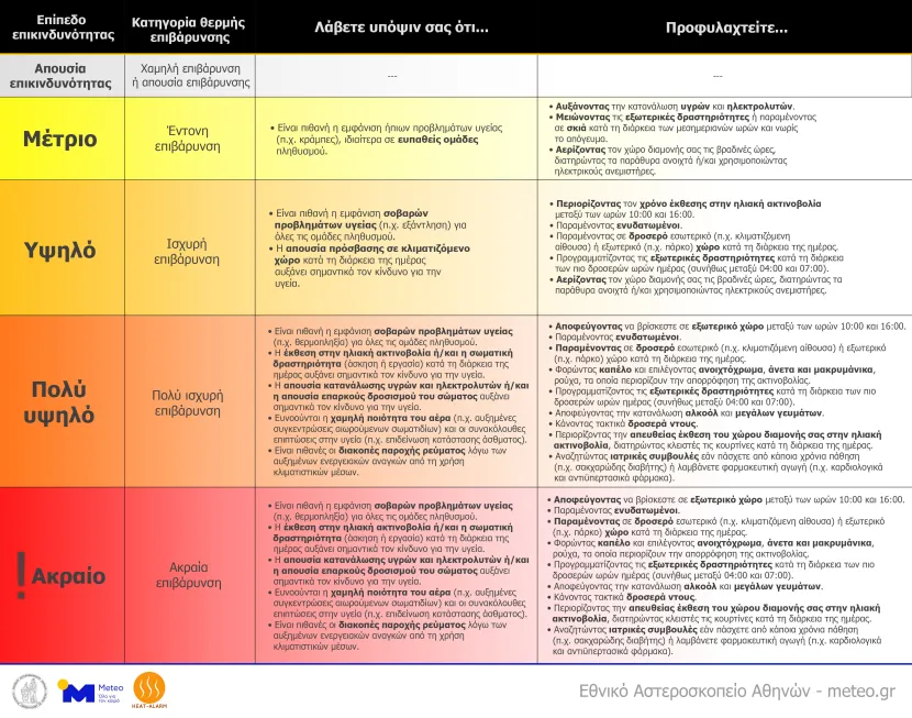 Το βιομετεωρολογικό σύστημα προειδοποίησης HEAT-ALARM εφαρμόζεται σε πιλοτικό στάδιο κατά την θερμή περίοδο (Απρίλιος-Οκτώβριος) του 2024. Περισσότερες πληροφορίες σχετικά με τα κριτήρια έκδοσης προειδοποίησης, αλλά και συνολικά για τη θερμή επιβάρυνση και το βιομετεωρολογικό σύστημα προειδοποίησης HEAT-ALARM, μπορούν να βρεθούν στο παρακάτω βίντεο.