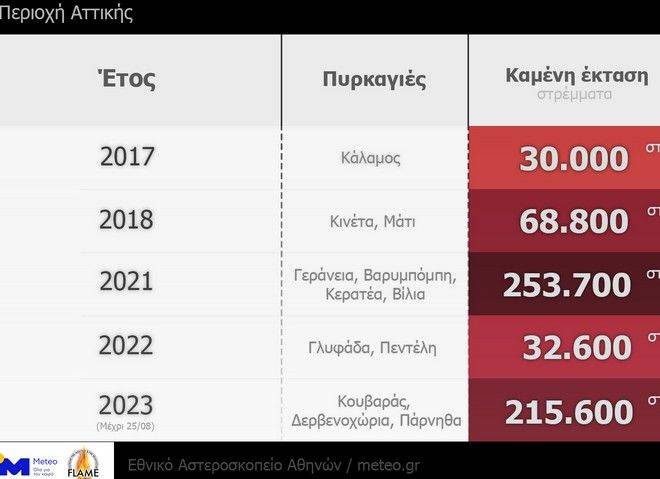 Εκείνο που προφανώς ενόχλησε την κυβέρνηση περισσότερο ήταν ο πίνακας του meteo.gr που έδειχνε ότι οι μεγαλύτερες καταστροφές σε έκταση, σημειώθηκαν το 2021 και το 2023. Το κείμενο των ειδικών στην ιστοσελίδα του meteo, το οποίο είναι “παιδί” του Εθνικού Αστεροσκοπείου, ανάφερε ότι «μόνο το 2021 και το 2023, ο αριθμός των καμένων εκτάσεων στην Αττική πλησιάζει το μισό εκατομμύριο στρέμματα. Η συνολική επιφάνεια της Περιφέρειας Αττικής είναι 2.500.000 στρέμματα, οπότε τα τελευταία 7 έτη το 25% της συνολικής επιφάνειας έχει καεί από δασικές πυρκαγιές. Στην Περιφέρεια Αττικής η επιφάνεια των δασικών εκτάσεων είναι περίπου 1.230.000 στρέμματα και τα τελευταία 7 χρόνια έχουν καεί 405.000 στρέμματα δάσους, δηλαδή το 33% της επιφάνειας των δασών».