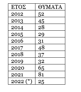 Αυτό το χειμώνα, όπως πάντα, οι θάνατοι άρχισαν από ορεινές περιοχές και από τη Βόρειο Ελλάδα, αλλά γρήγορα σημειώθηκαν και σε νοτιότερες ή πιο πεδινές περιοχές, καθώς ο χειμώνας “μπήκε” παντού. Φέτος το χειμώνα, χάθηκαν μέχρι στιγμής 76 άνθρωποι, δηλαδή 51 από τον Οκτώβρη του 2021 και άλλοι 25 από την 1η Ιανουαρίου μέχρι και τις 10 Μαρτίου του 2022. Οι αριθμοί είναι πρωτοφανείς. Σύμφωνα με τα στοιχεία της Πυροσβεστικής, που την ευχαριστούμε για την άμεση ανταπόκρισή της, καταγράφονται οι θάνατοι κατ΄ έτος. Πρώτο ρεκόρ θανάτων ήταν το 2020 με 65 θανάτους και το επόμενο ρεκόρ θανάτων ήταν του 2021 με 88.